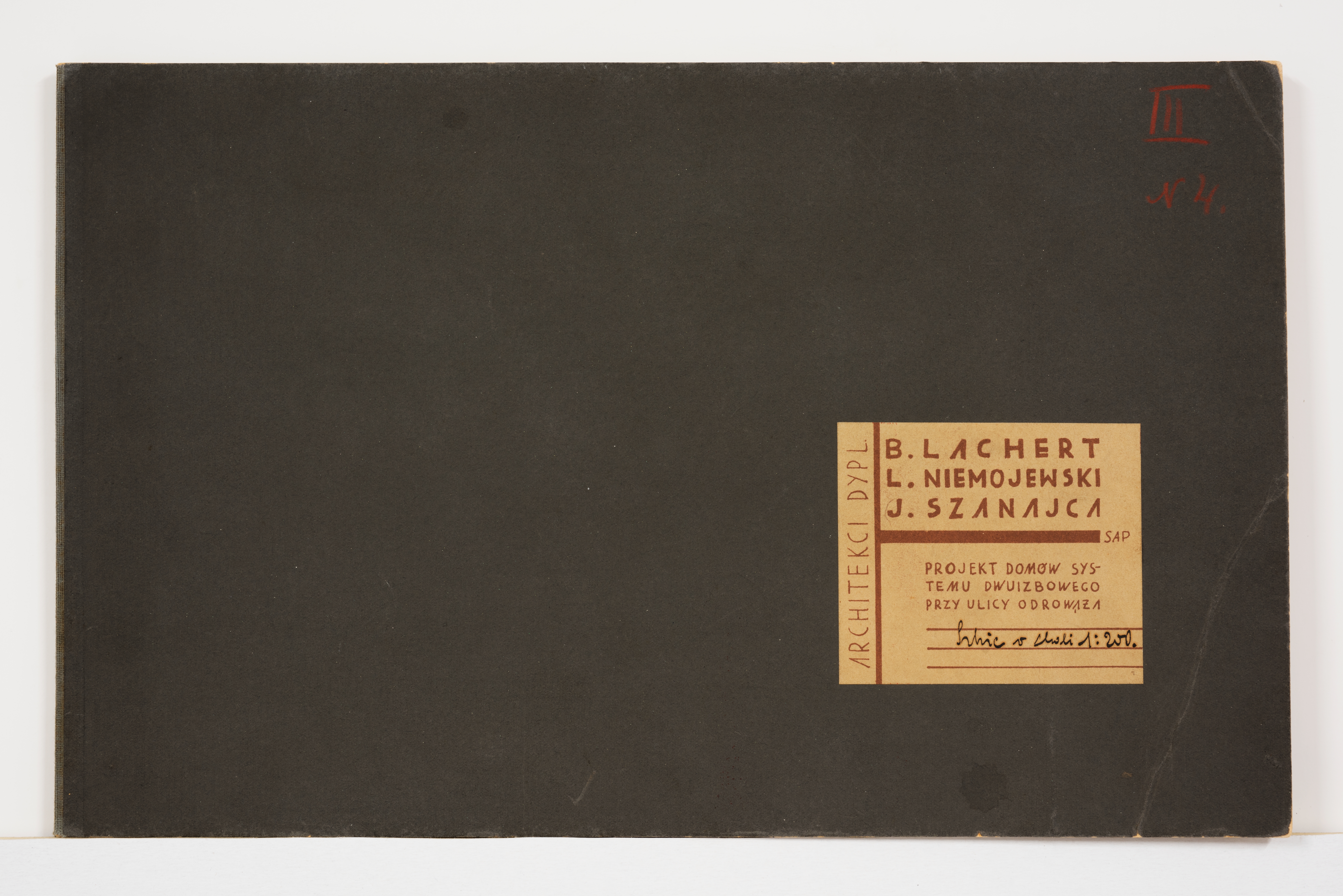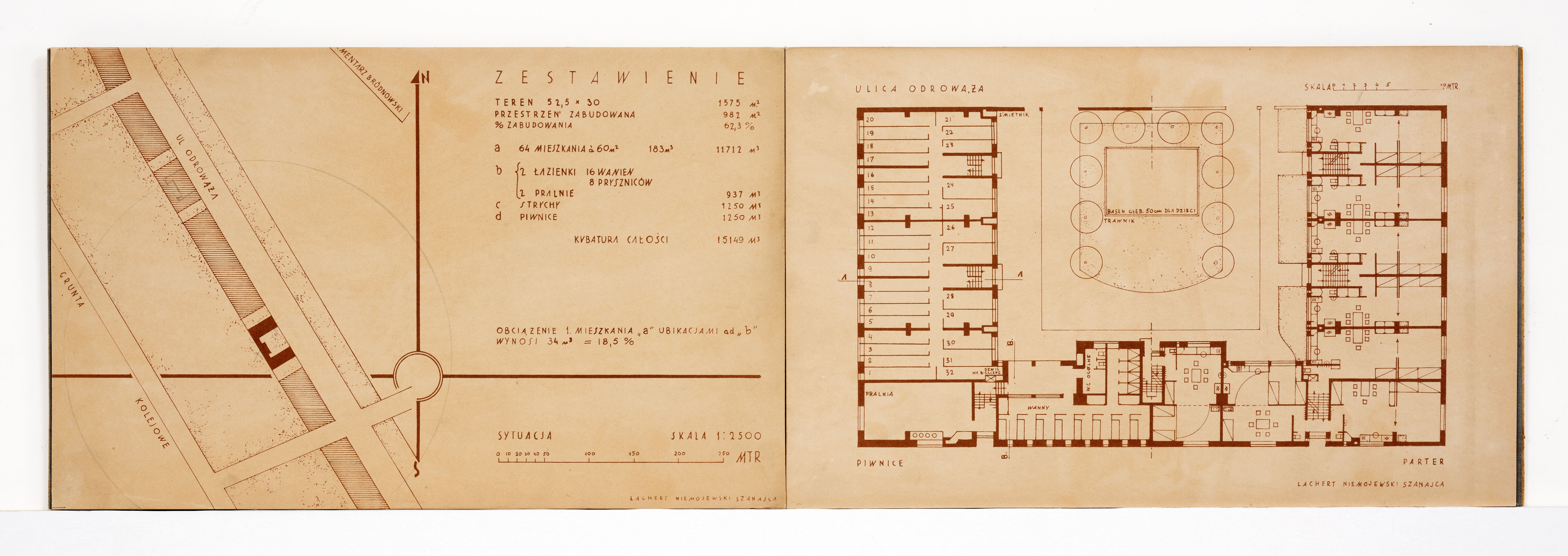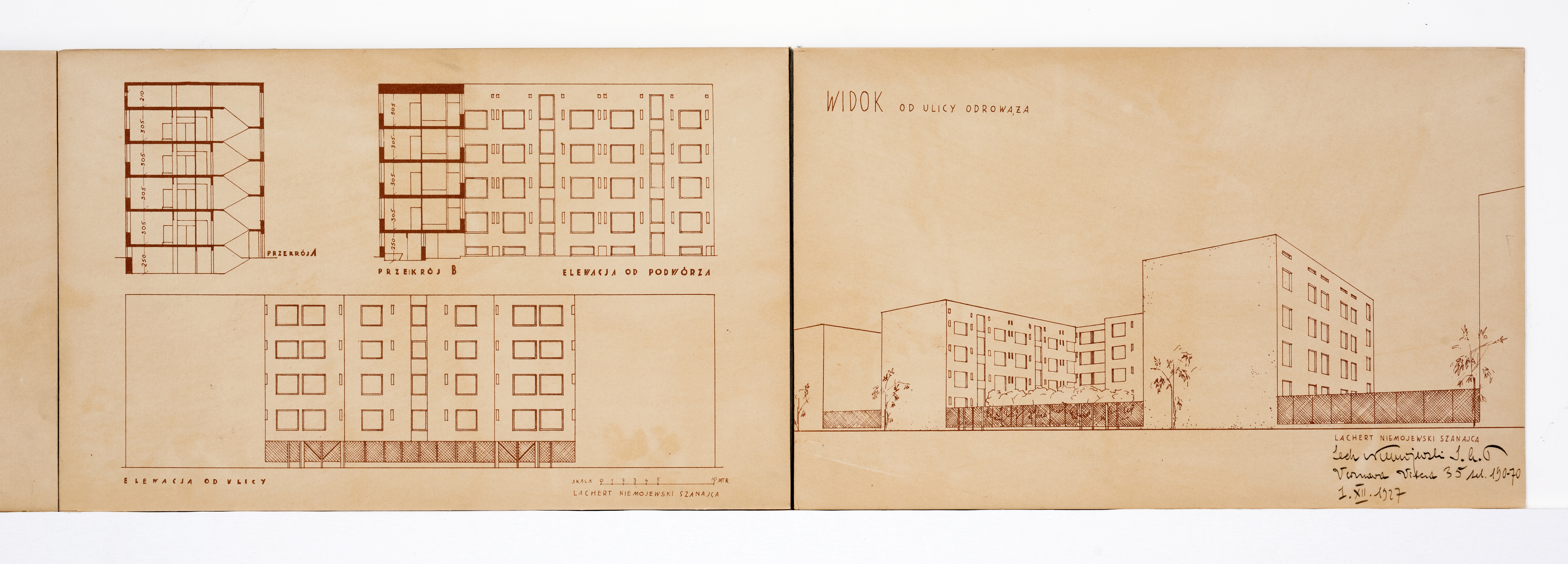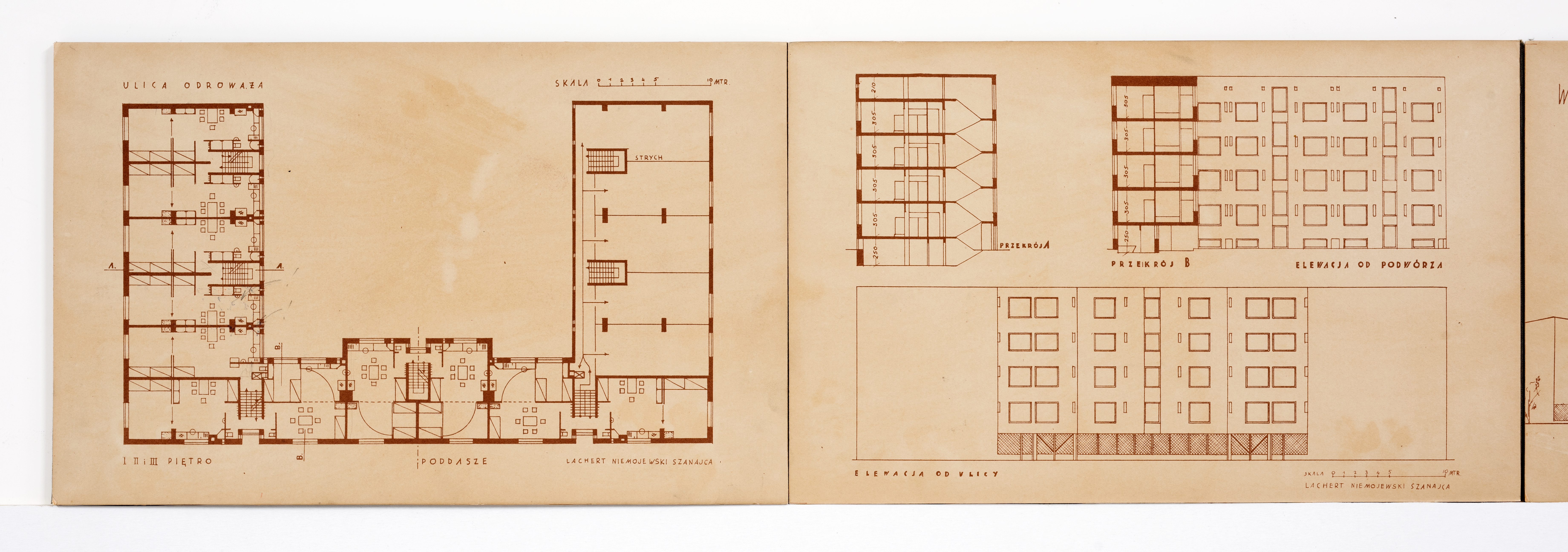 file with 5 copies of designs for the staircase-access building: site plan including the lists of floor areas and cubature, plan of basements, ground floor, 1st, 2nd, 3rd floor and the attic, cross-sections A and B, front facade (from the courtyard) of the northern wing and the whole structure from the street, perspective view