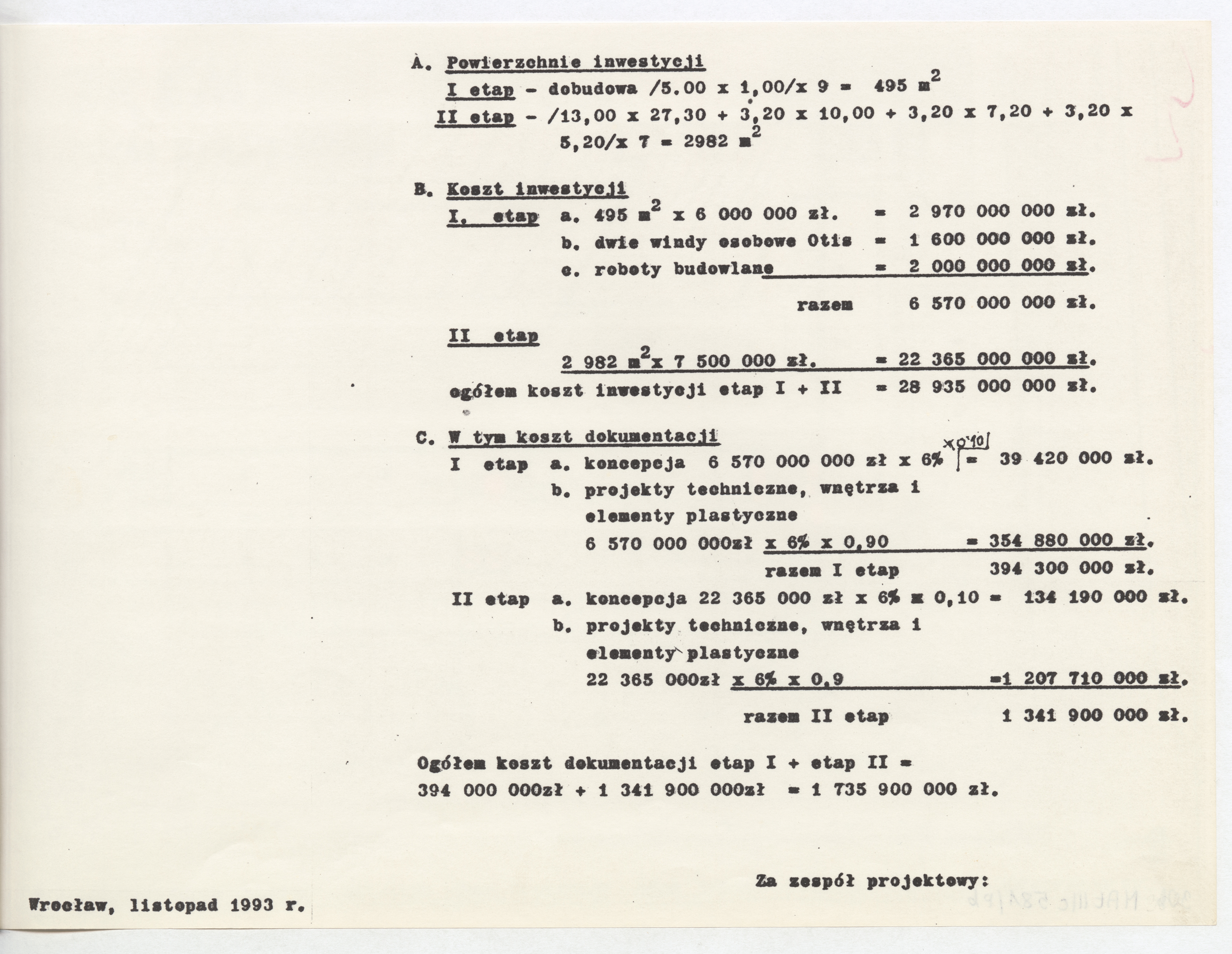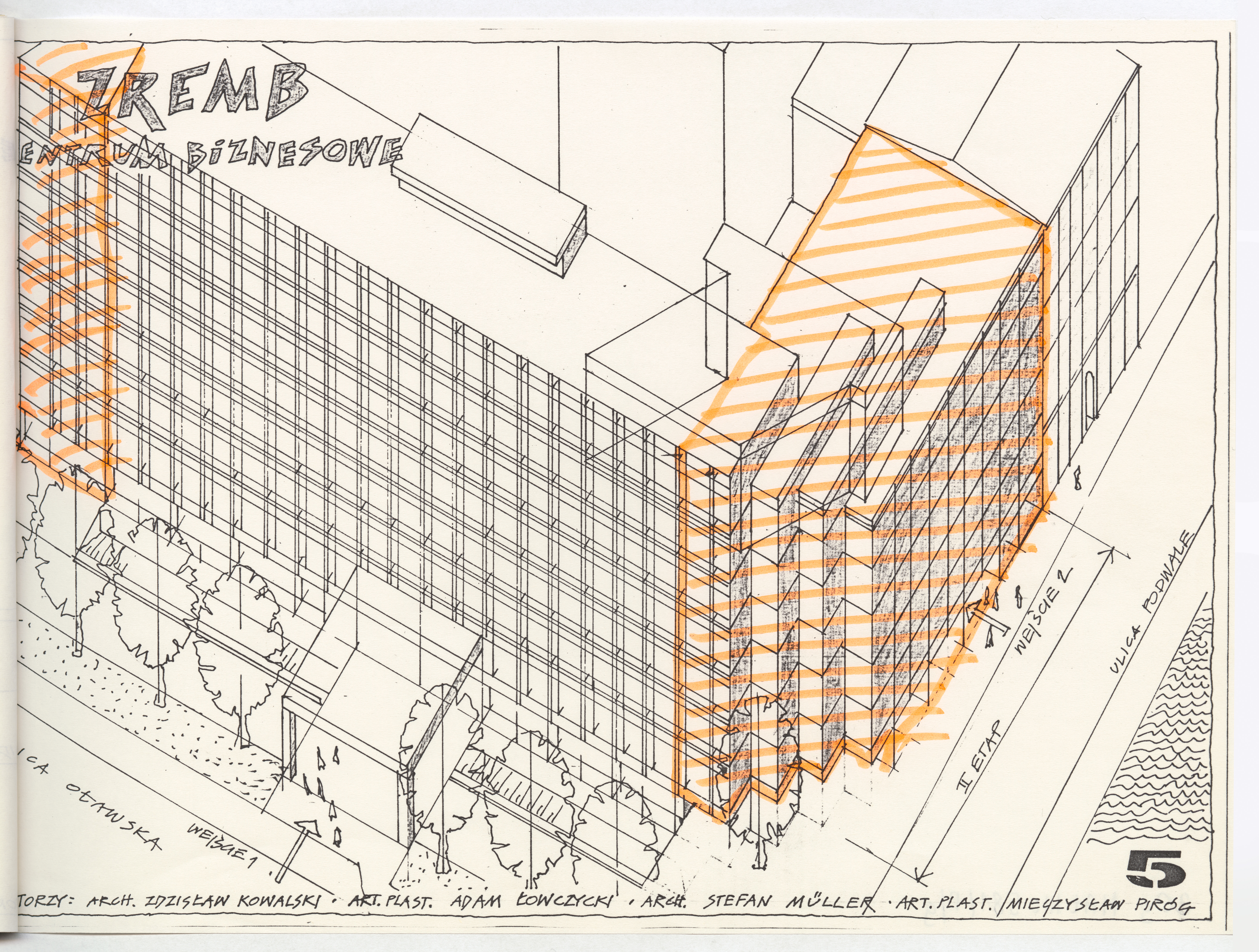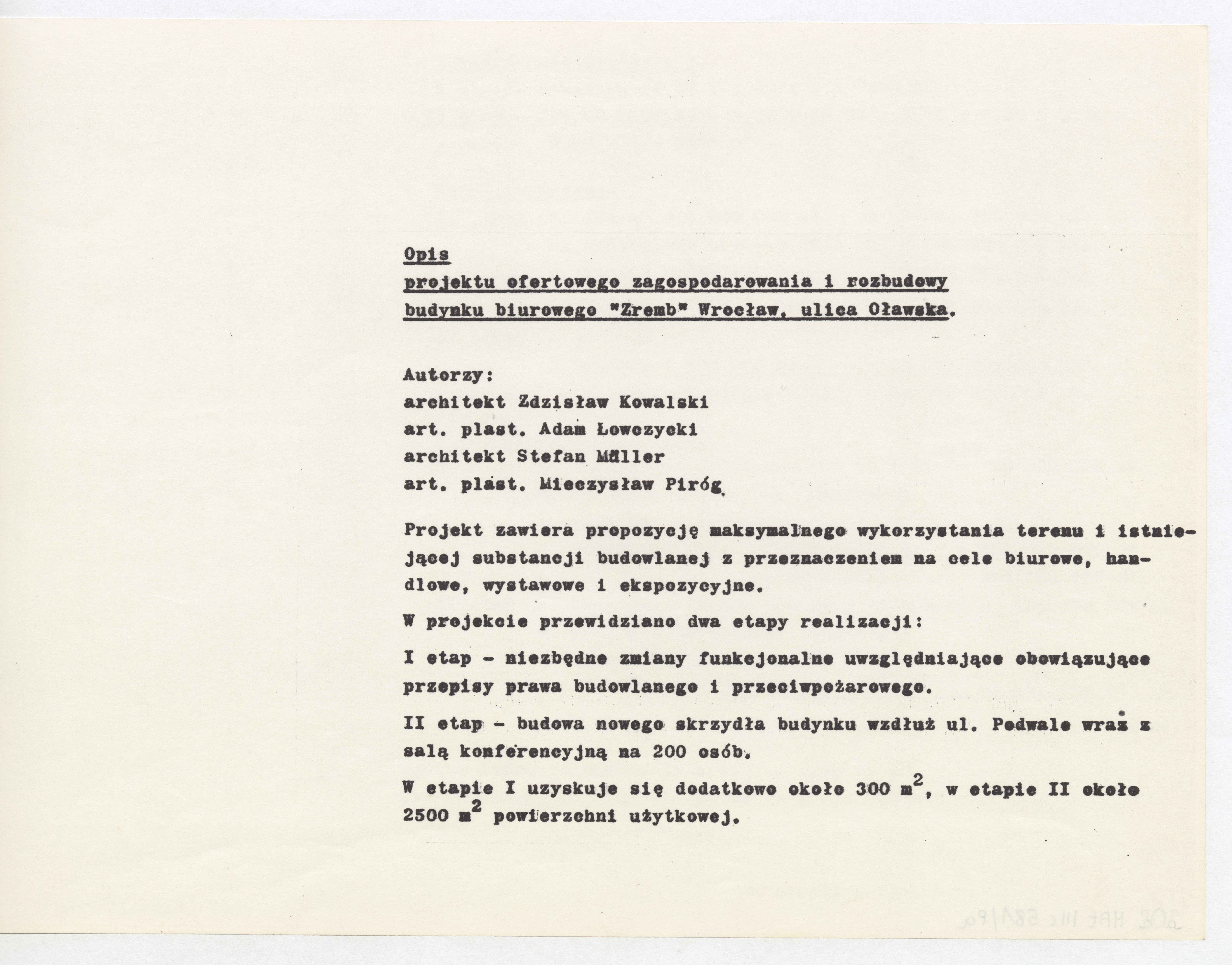 - ground and typical floor plans, facades from Oławska and Podwale Streets, axonometric view from above, project description