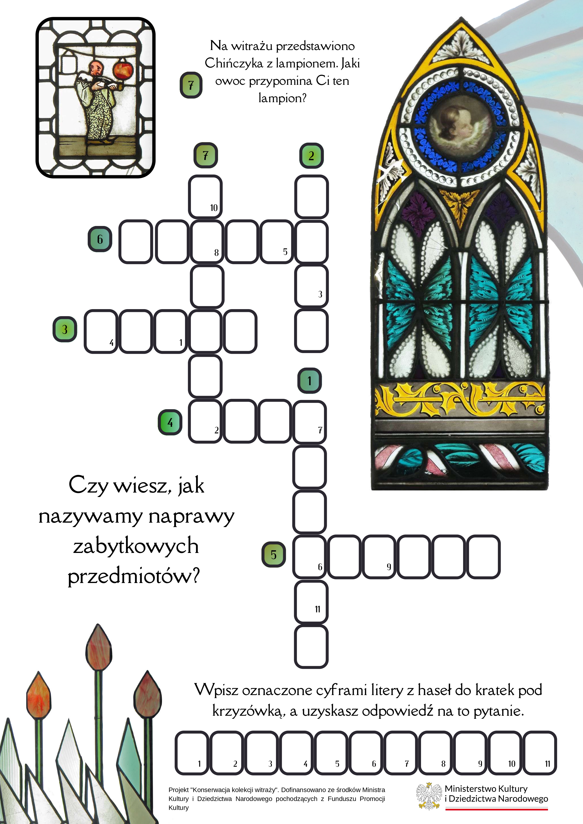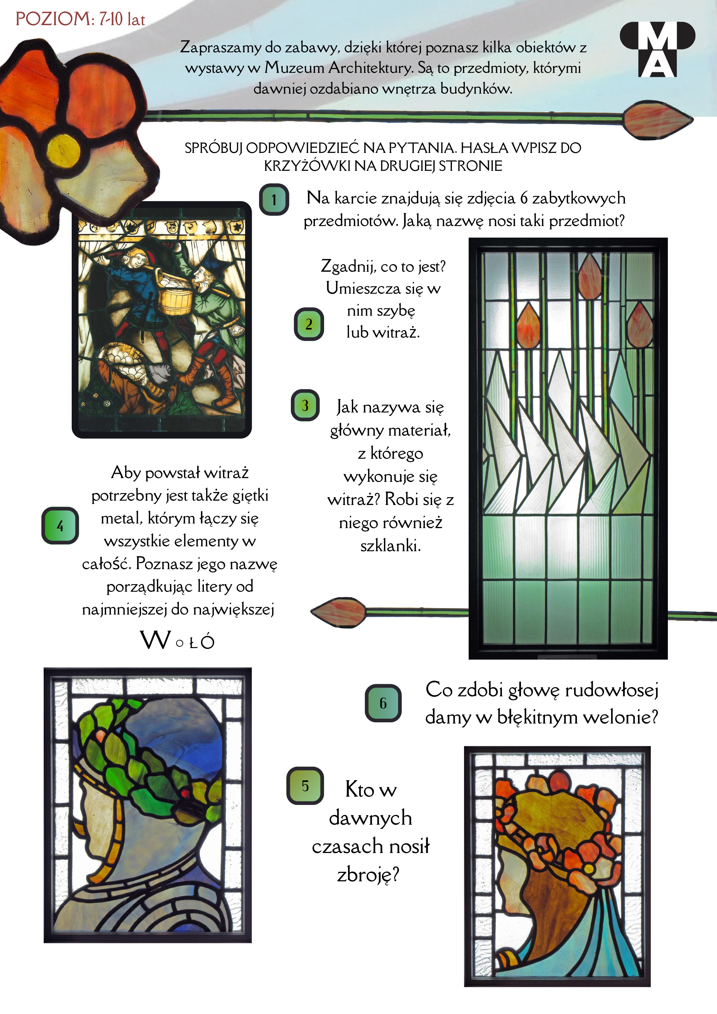 W ramach naszego tegorocznego projektu Konserwacja kolekcji witraży, opracowaliśmy dla najmłodszych pasjonatów sztuki kartę z krzyżówką. Wprowadza ona dzieci w kolorowy świat witraży, pozwola im poznać, czym jest witraż oraz prezentuje kilka eksponatów z naszej wystawy rzemiosła artystycznego.
