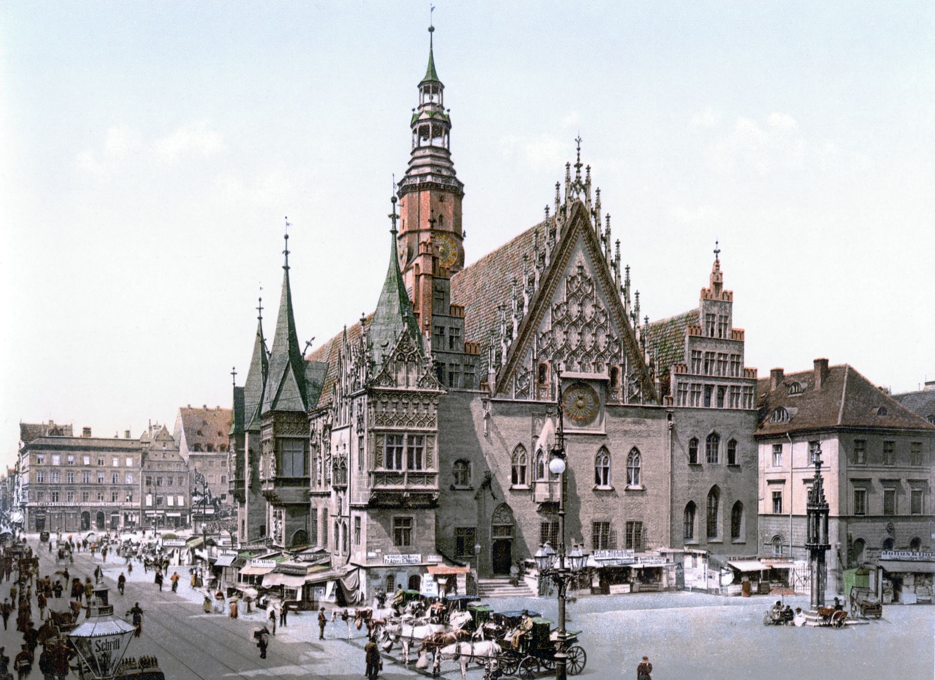 Wrocławski ratusz między rokiem 1890 a 1900, zasoby Biblioteki Kongresu Stanów Zjednoczonych, oddziału Prints and Photographs division, źródło: Wikimedia Commons