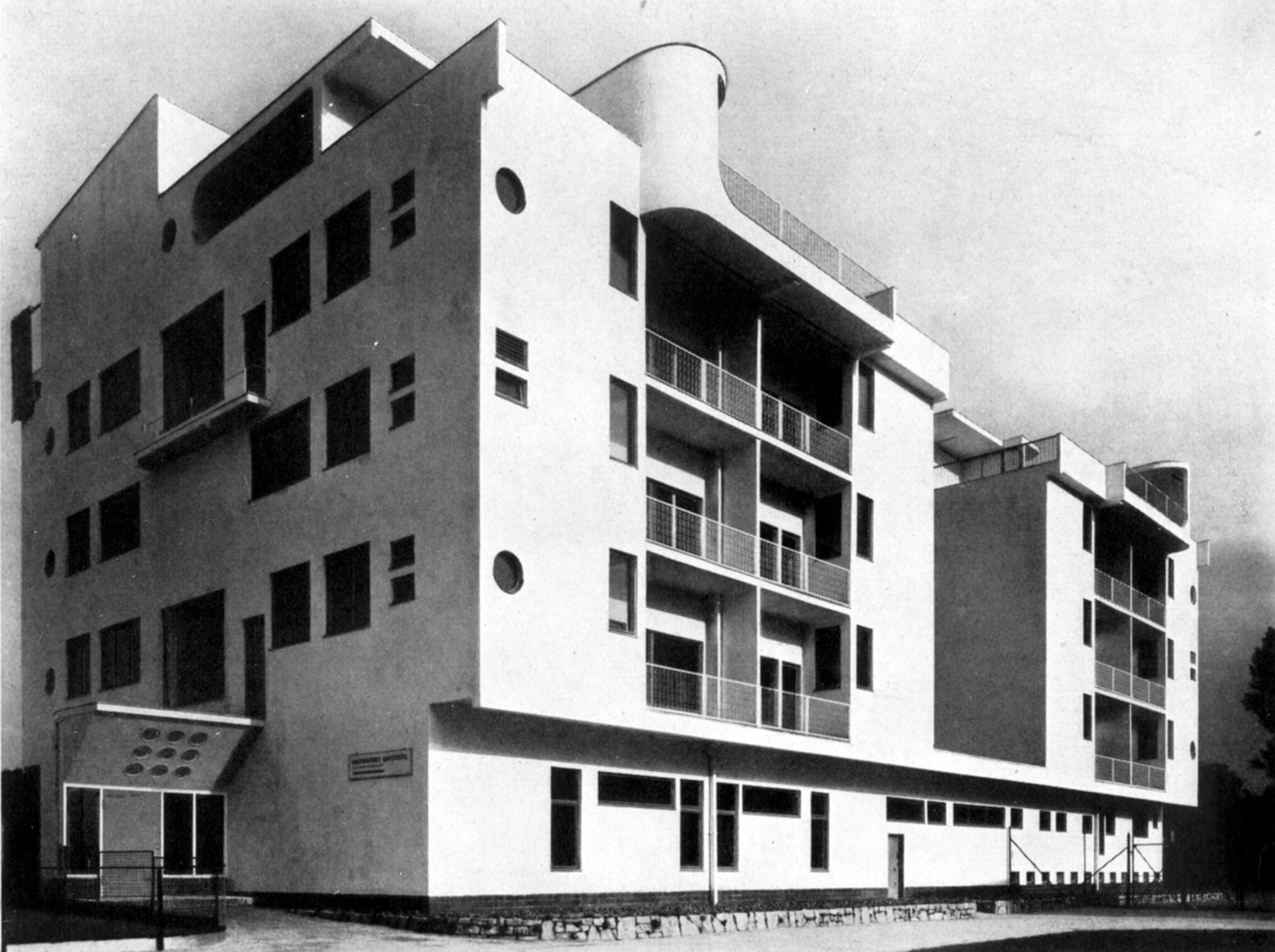 “Attention! Attention! We’re speaking to you from Wroclaw and Gliwice. Ladies and Gentlemen, we announce that the Silesian Broadcasting will provide you with detailed coverage of the departure of the Wuwag oceanic steamboat. (…) Our announcer will take up position on the tower of the Church of the Holy Cross and will present you his impressions while the ship passes the Cathedral Island”- journalist Rudolf Hillebrand wrote mockingly in his article from 1930. The satirical story of a passenger ship created as part of the Werkbund exhibition in Wroclaw entitled “Living and Work Space” (Wohnung und Werkraum - Wuwa) was a response to the criticism of the model housing estate. The abovementioned steamboat referred to the community house (Turmhaus) designed by Rading in 1929, resembling a ship with railings and terraces on the roofs.