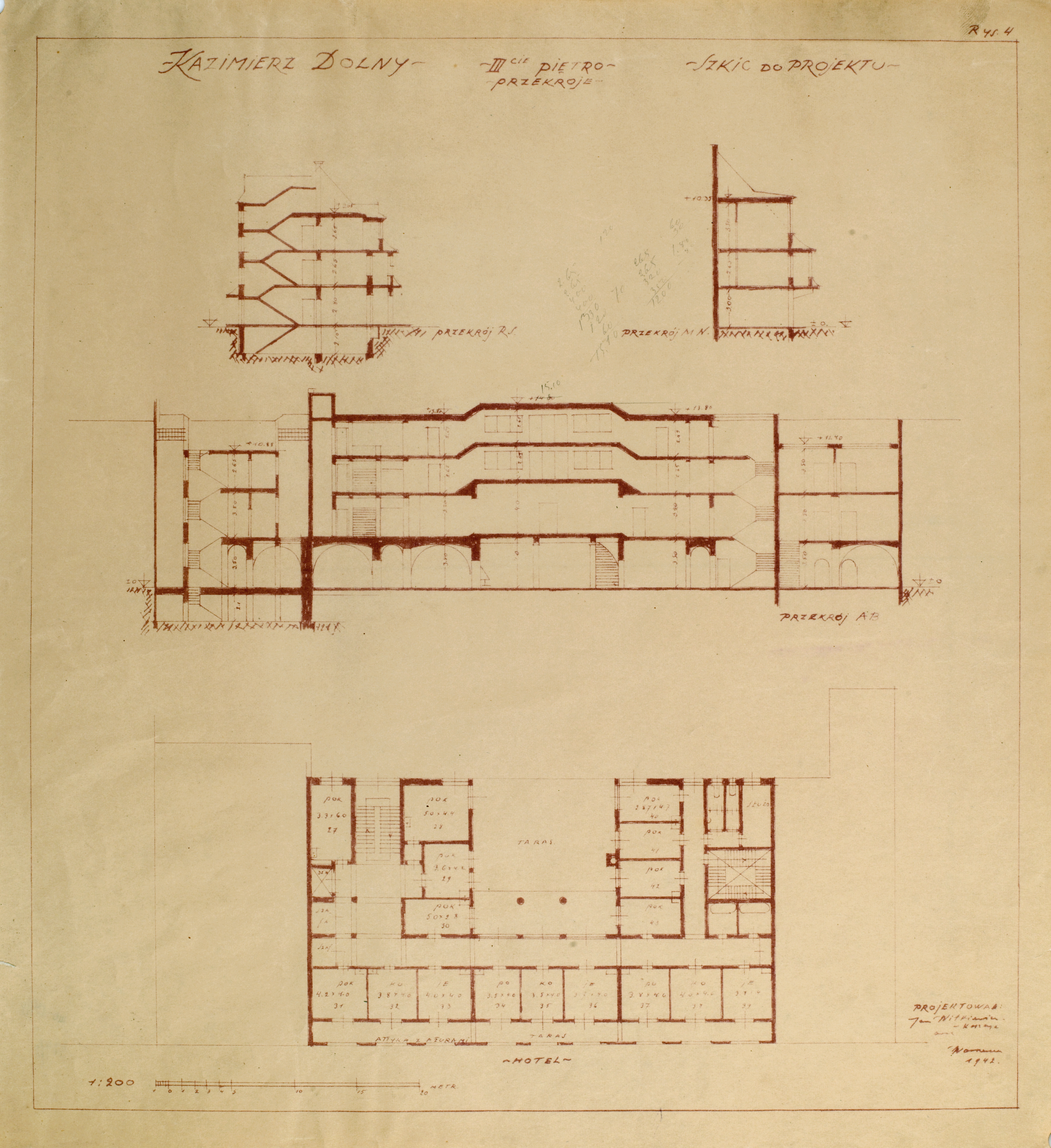 - hotel - rzut 3. piętra, przekroje poprzeczny i podłużny; oficyna - przekrój poprzeczny