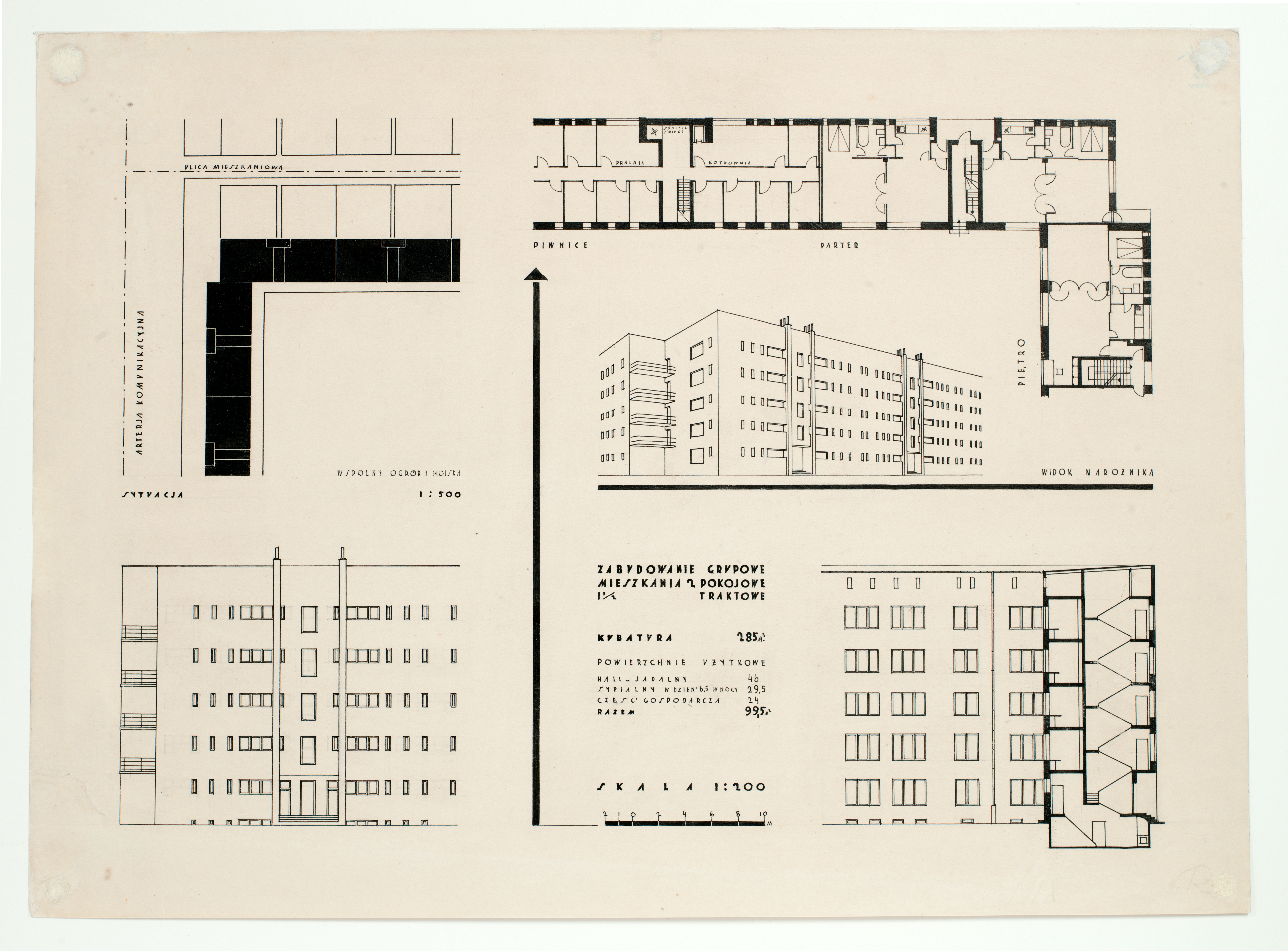 plan sytuacyjny, fragmenty rzutów piwnic, parteru i 1. piętra z przykładowymi aranżacjami mieszkań, przekrój poprzeczny klatki schodowej, elewacje frontowa i tylna, widok perspektywiczny od strony narożnika, wykazy powierzchni i kubatury