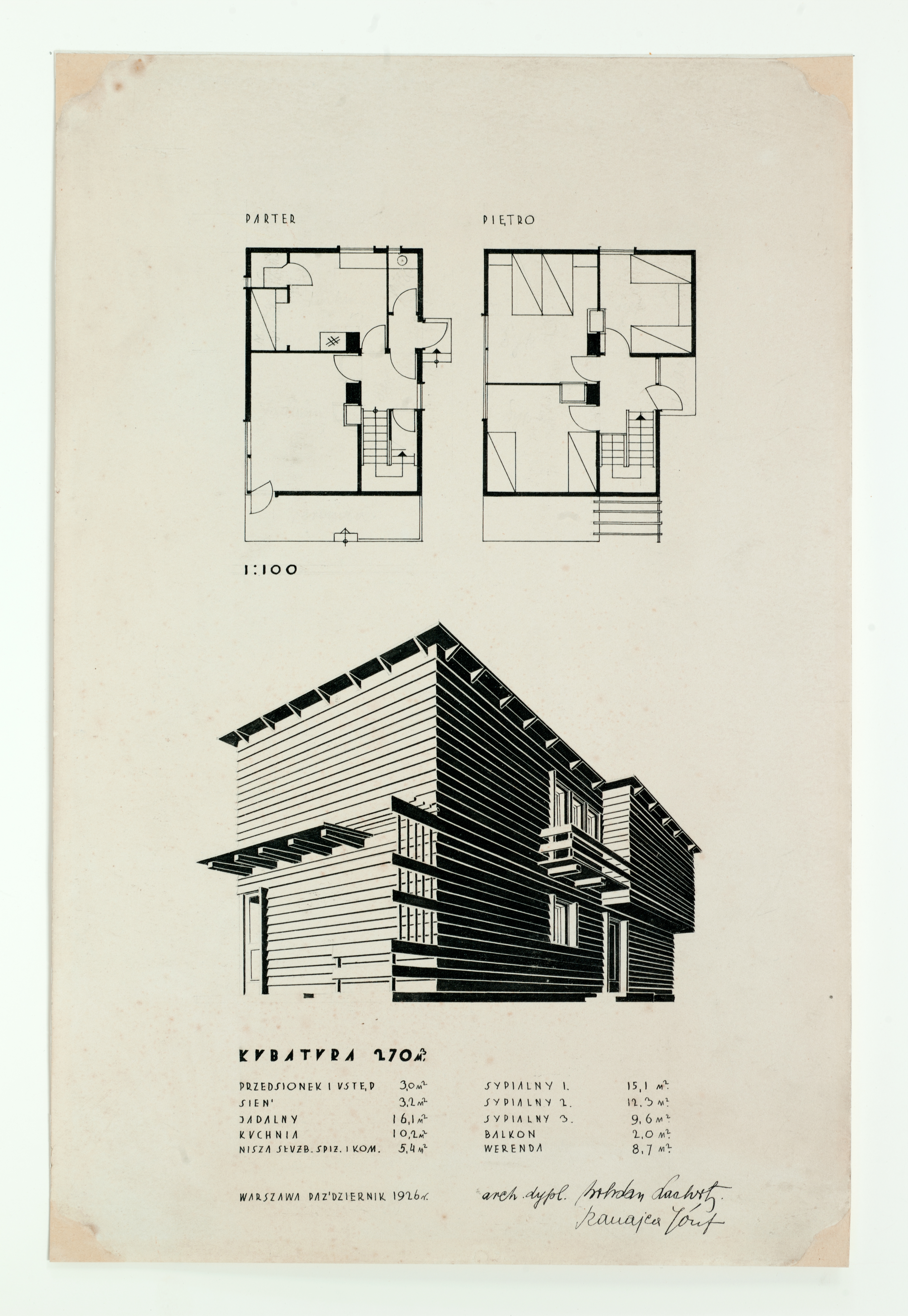 - rzuty parteru i 1. piętra, widok perspektywiczny, wykaz powierzchni