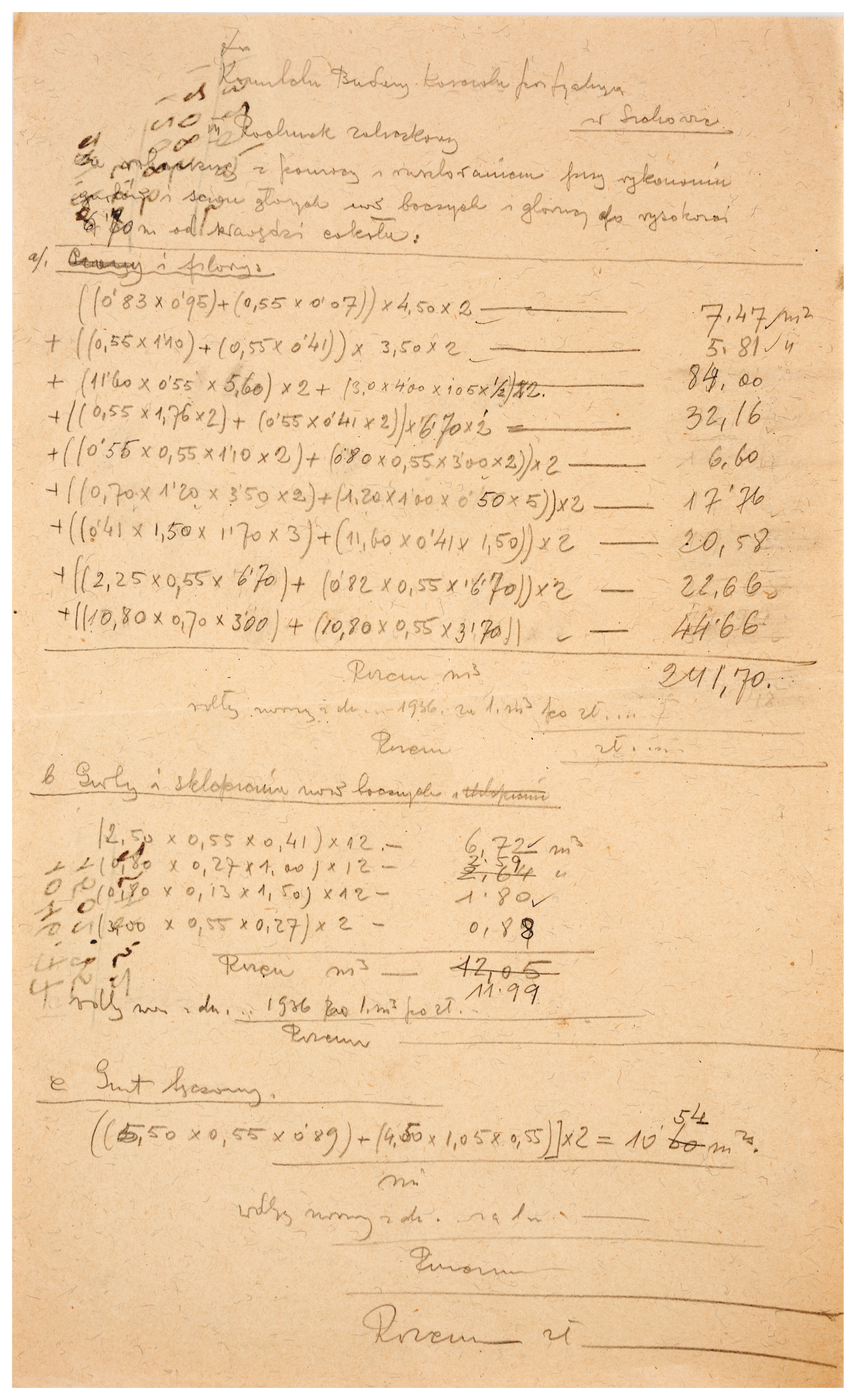 odręczny brudnopis rachunku zaliczkowego za wykonanie murów fundamentowych kościoła z zestawieniem wykonanych murów, wystawiony przez nieznanego wykonawcę Komitetowi Budowy kościoła parafialnego w Sichowie, 1. karta