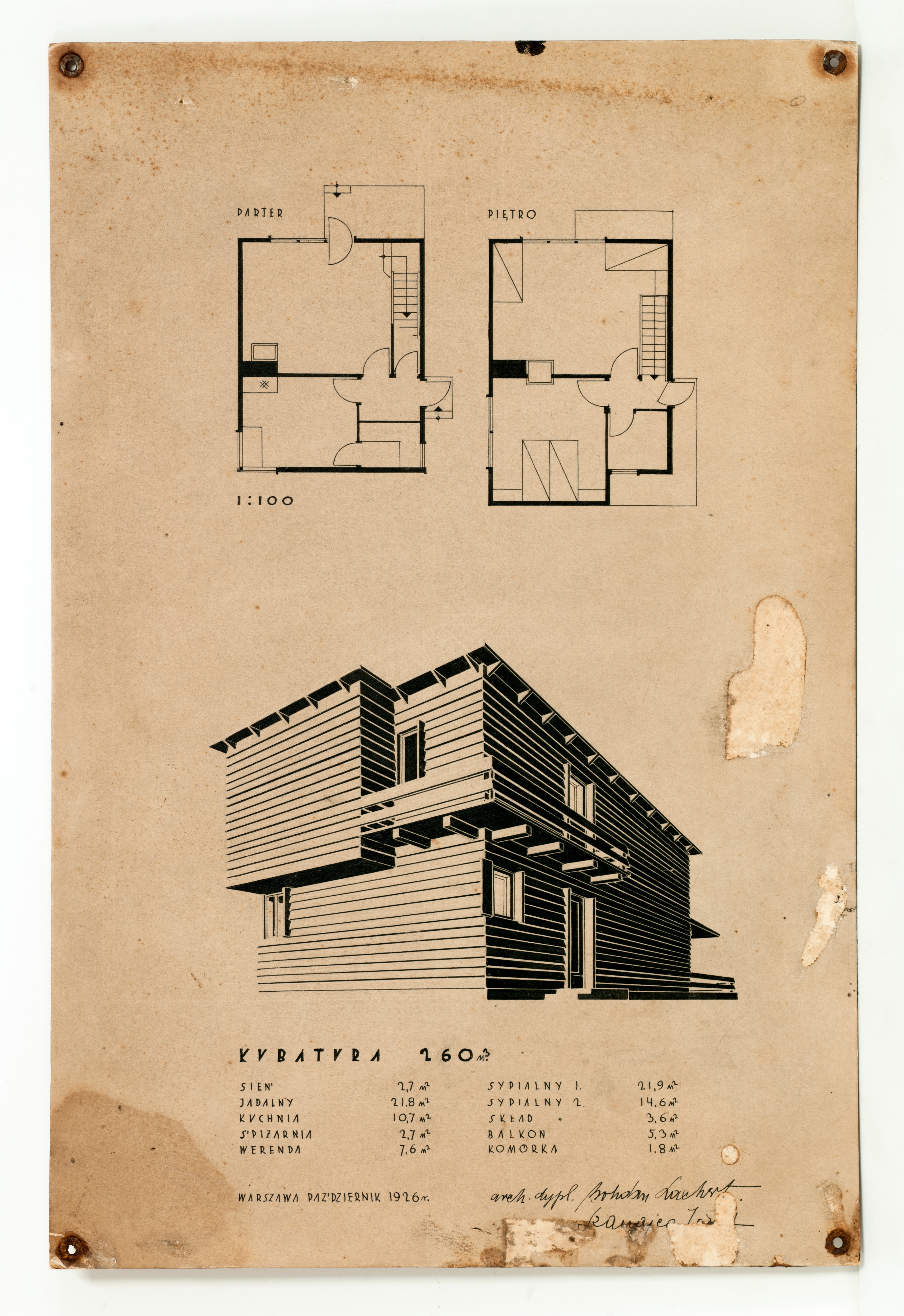 - rzuty parteru i 1. piętra, widok perspektywiczny, wykaz powierzchni