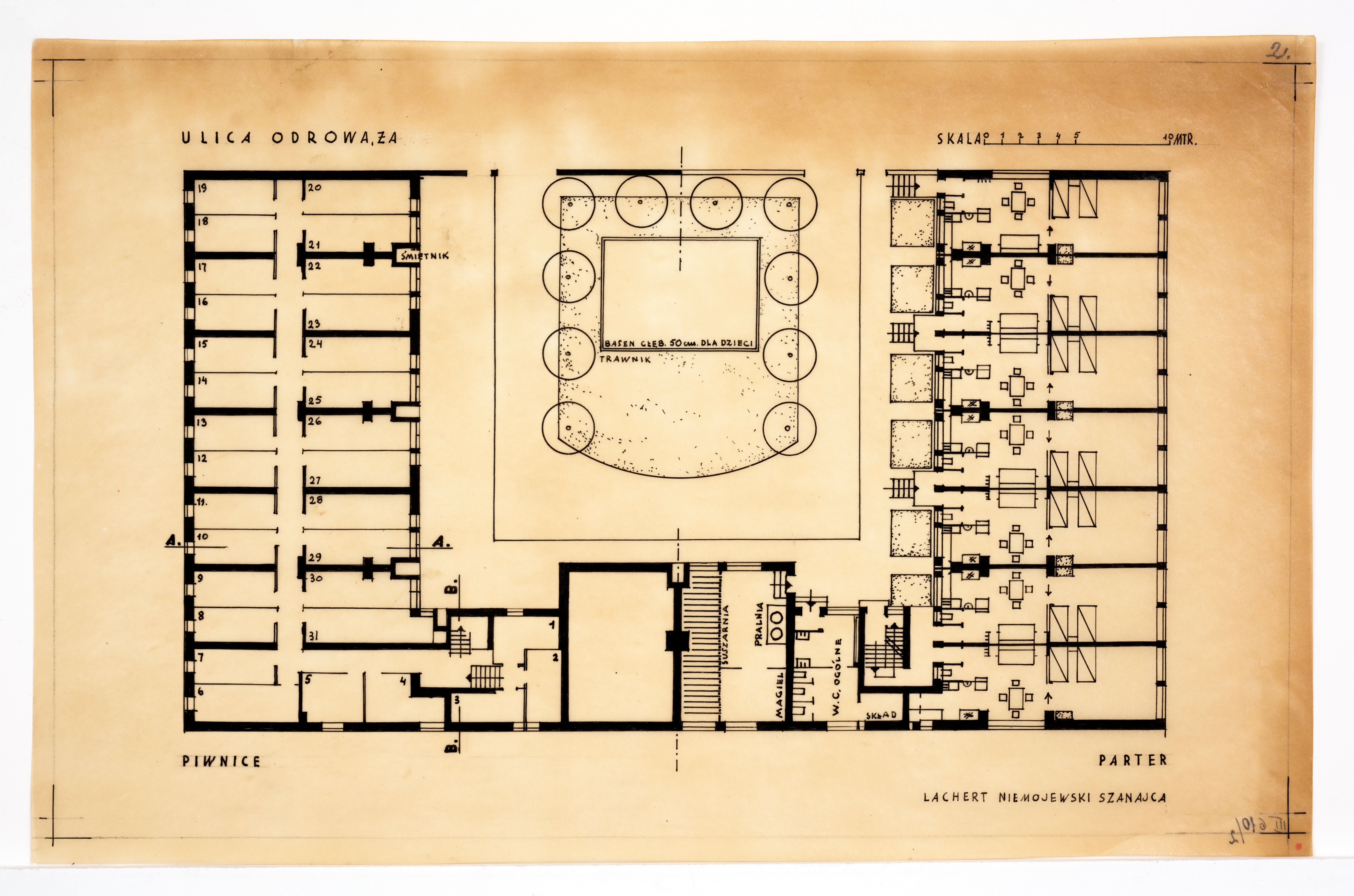- rzuty piwnic i parteru z zarysem basenu dla dzieci i kształtem trawnika