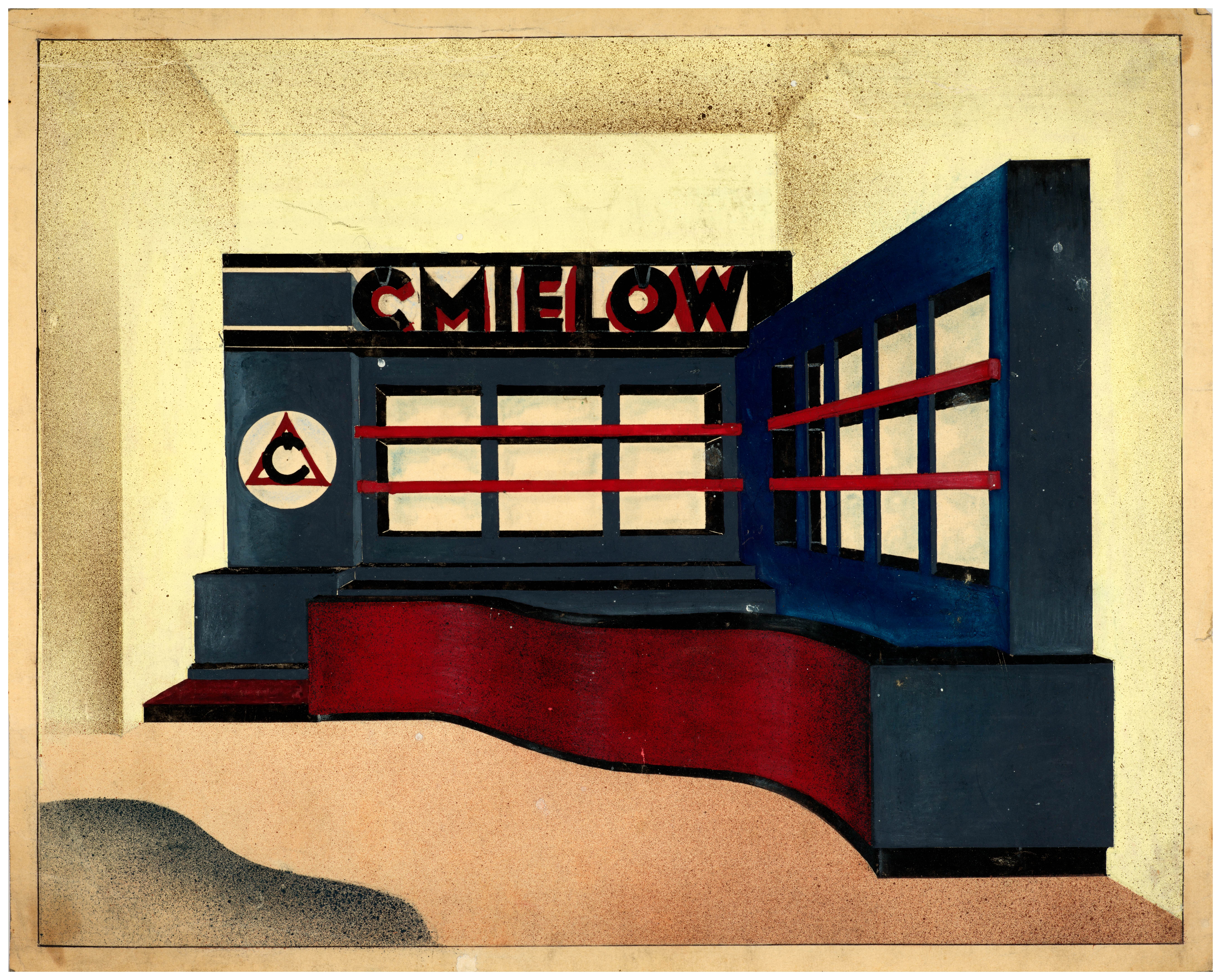Stoisko Fabryki Porcelany "Ćmielów" na Międzynarodowych Targach Wschodnich w Lwowie Teodorowicz-Todorowski Tadeusz 1939.07.19 Ta przeglądarka nie obsługuje elementu audio. Link do pliku dźwiekowego. Lwów widok perspektywiczny Sygnatura MAt IIIb-93/P karton tusz, ołówek, gwasz, akwarela 25,5 x 31,5 cm