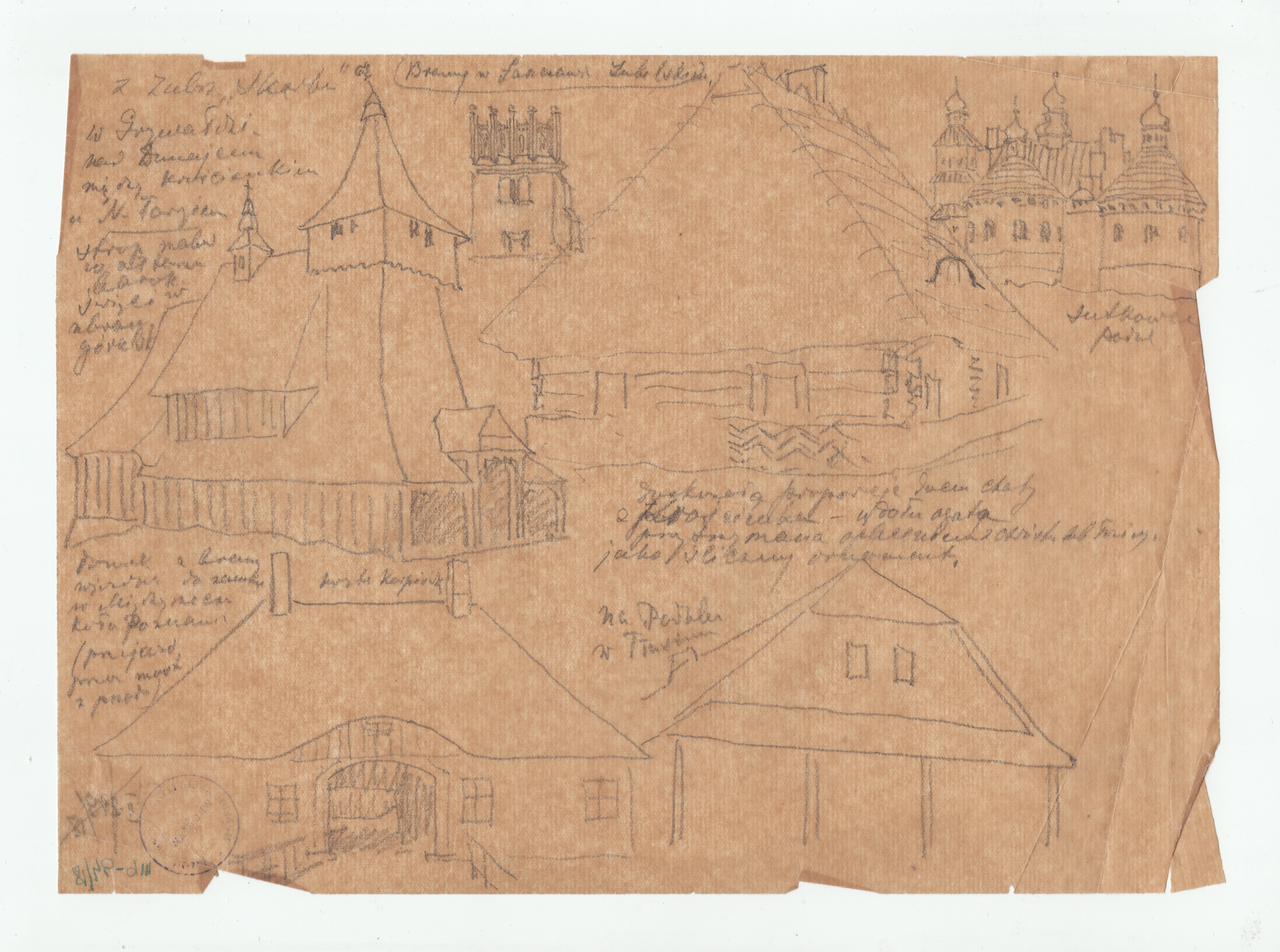 Szkice architektoniczne. Kościół w Grywałdzie, budynki bramne w Łaszczowie koło Lublina i w zamku w Międzyrzeczu koło Poznania, zamek w Sutkowcach, chata na Podolu, cerkiew