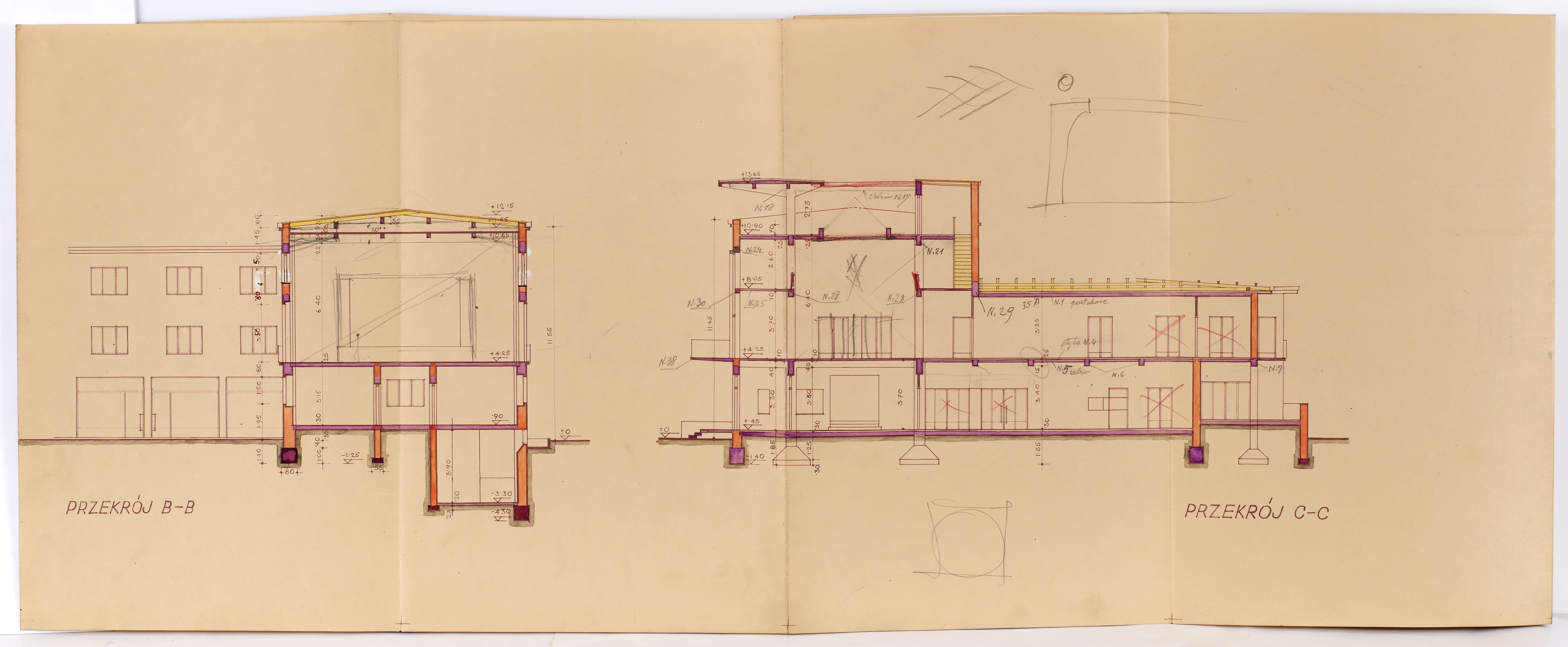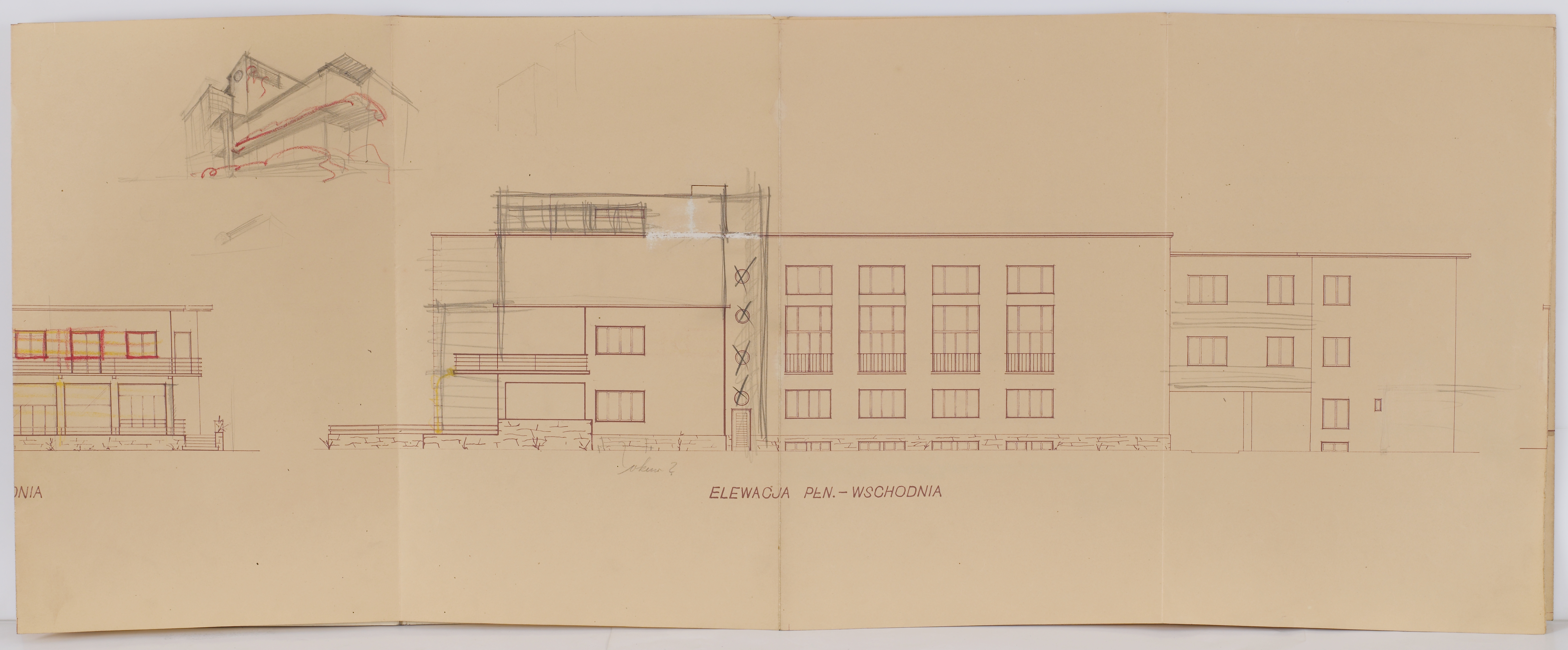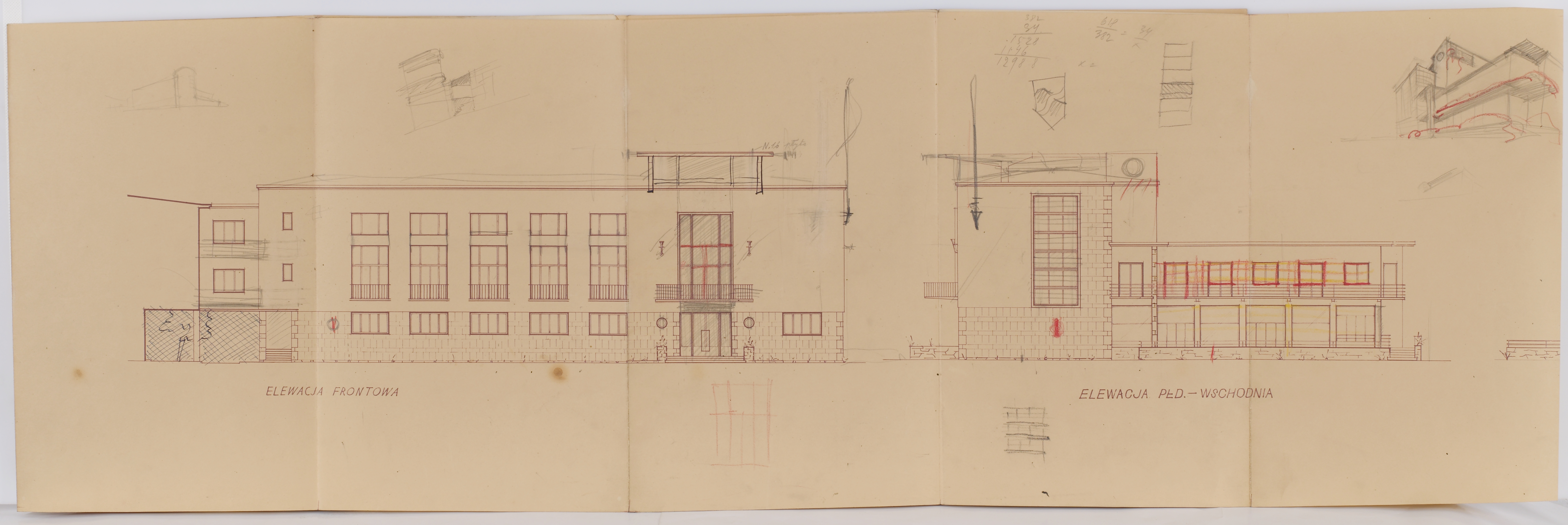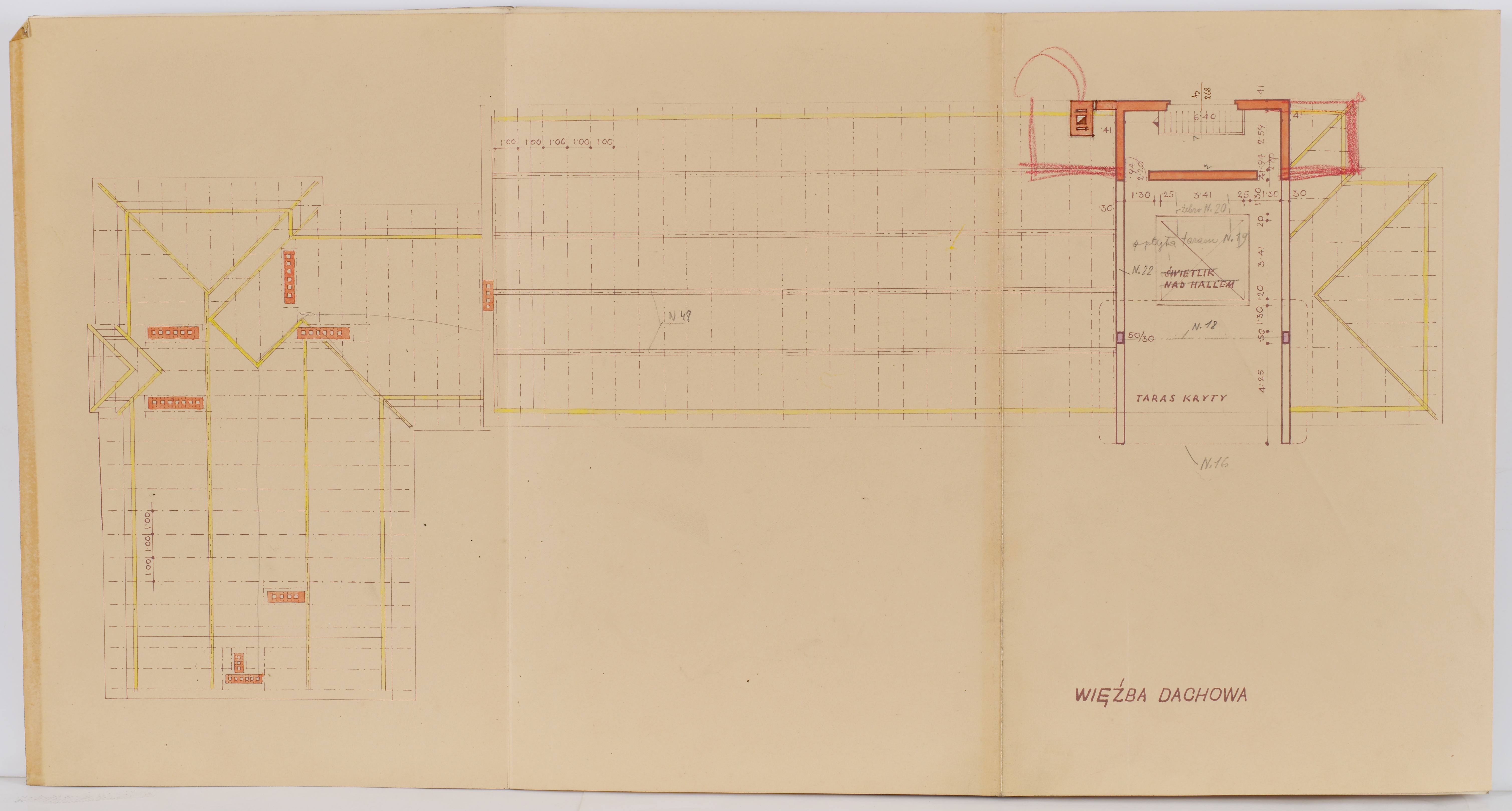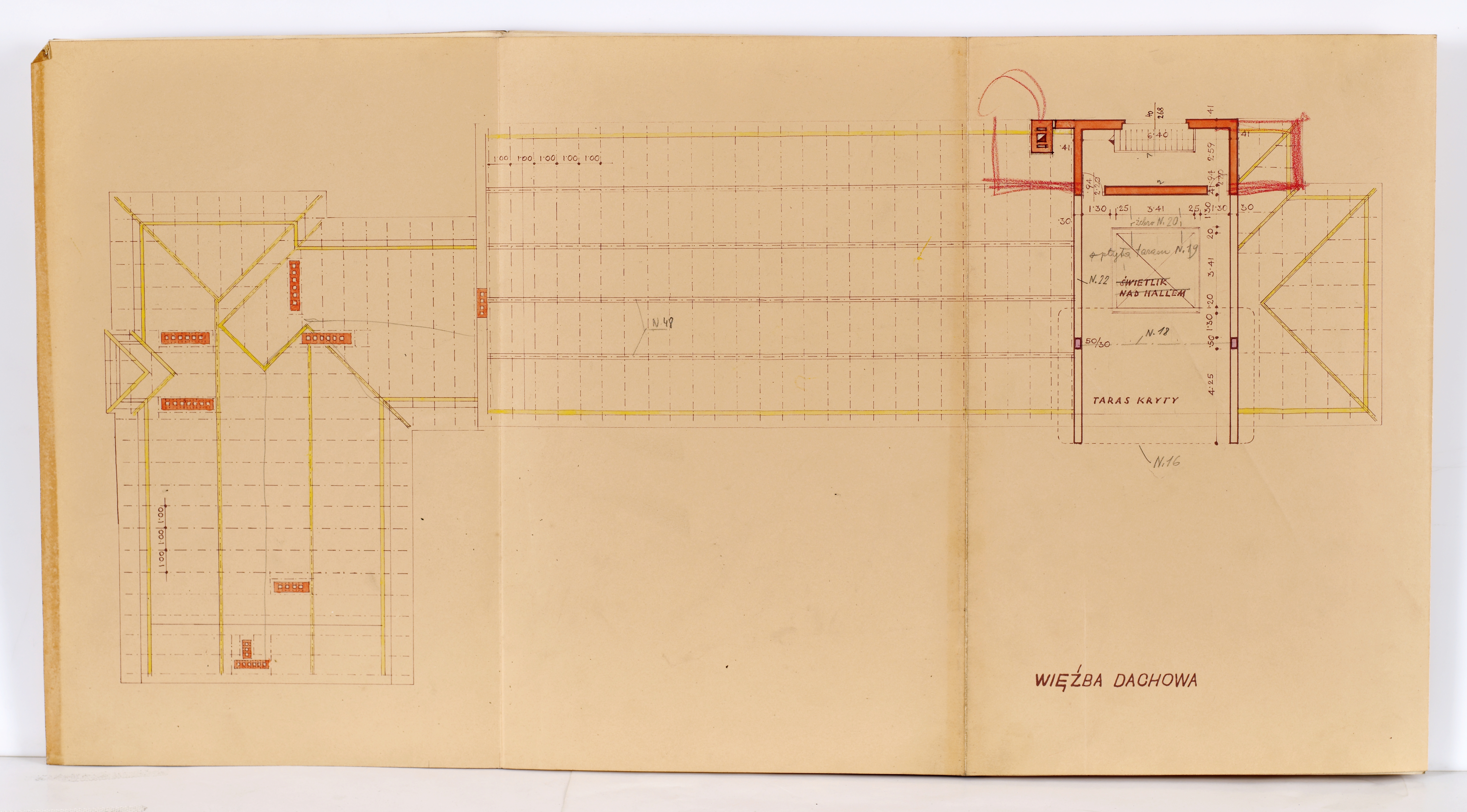 - rzut więźby dachowej, przekroje A-A, B-B i C-C, elewacje frontowa, południowo-wschodnia i północno-wschodnia, widoki perspektywiczne, detale