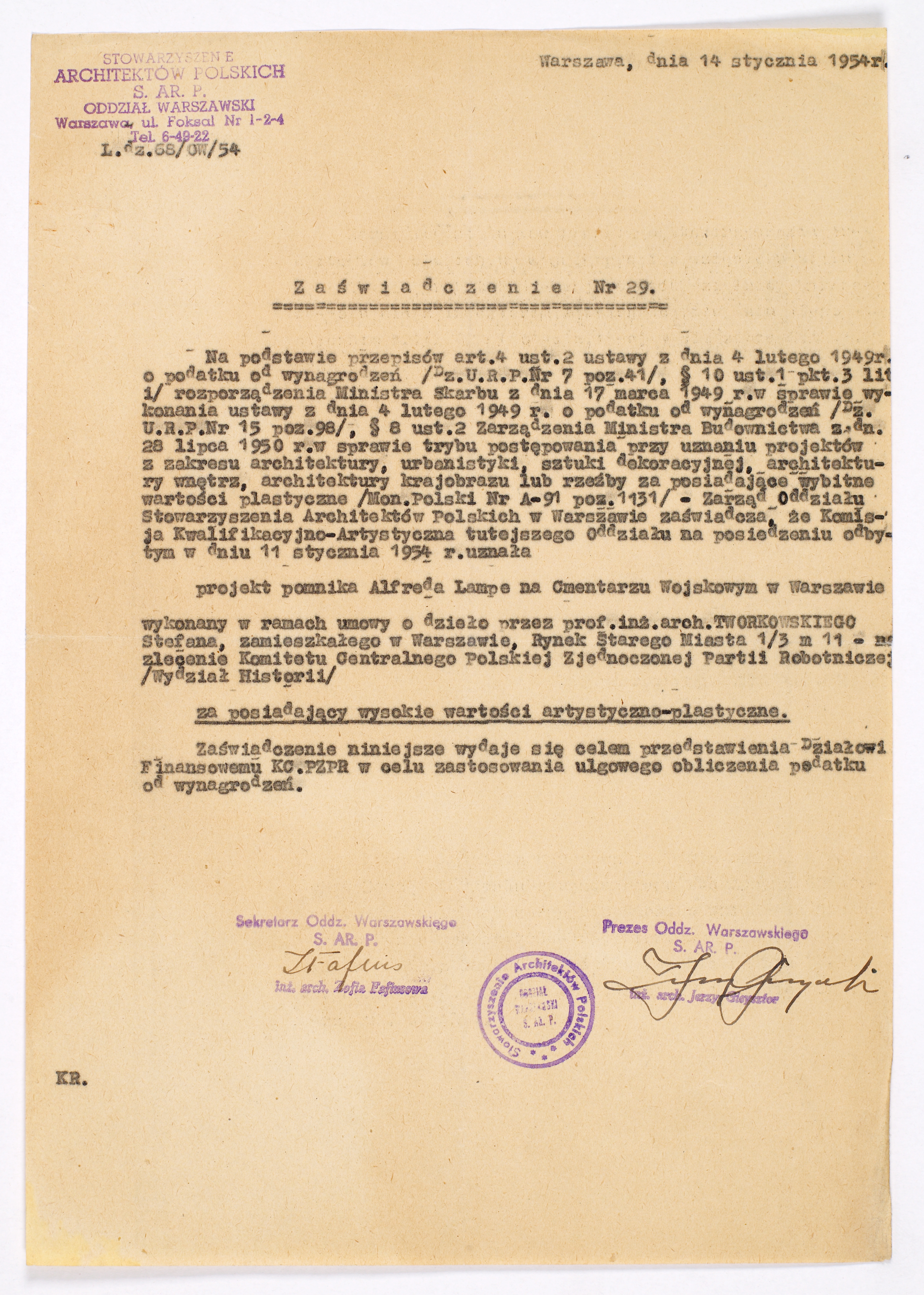 zaświadczenie prezesa warszawskiego oddziału SARP arch. Jerzego Gieysztora oraz sekretarz arch. Zofii Fafius o uznaniu projektu pomnika za dzieło o wysokich wartościach artystyczno-plastycznych