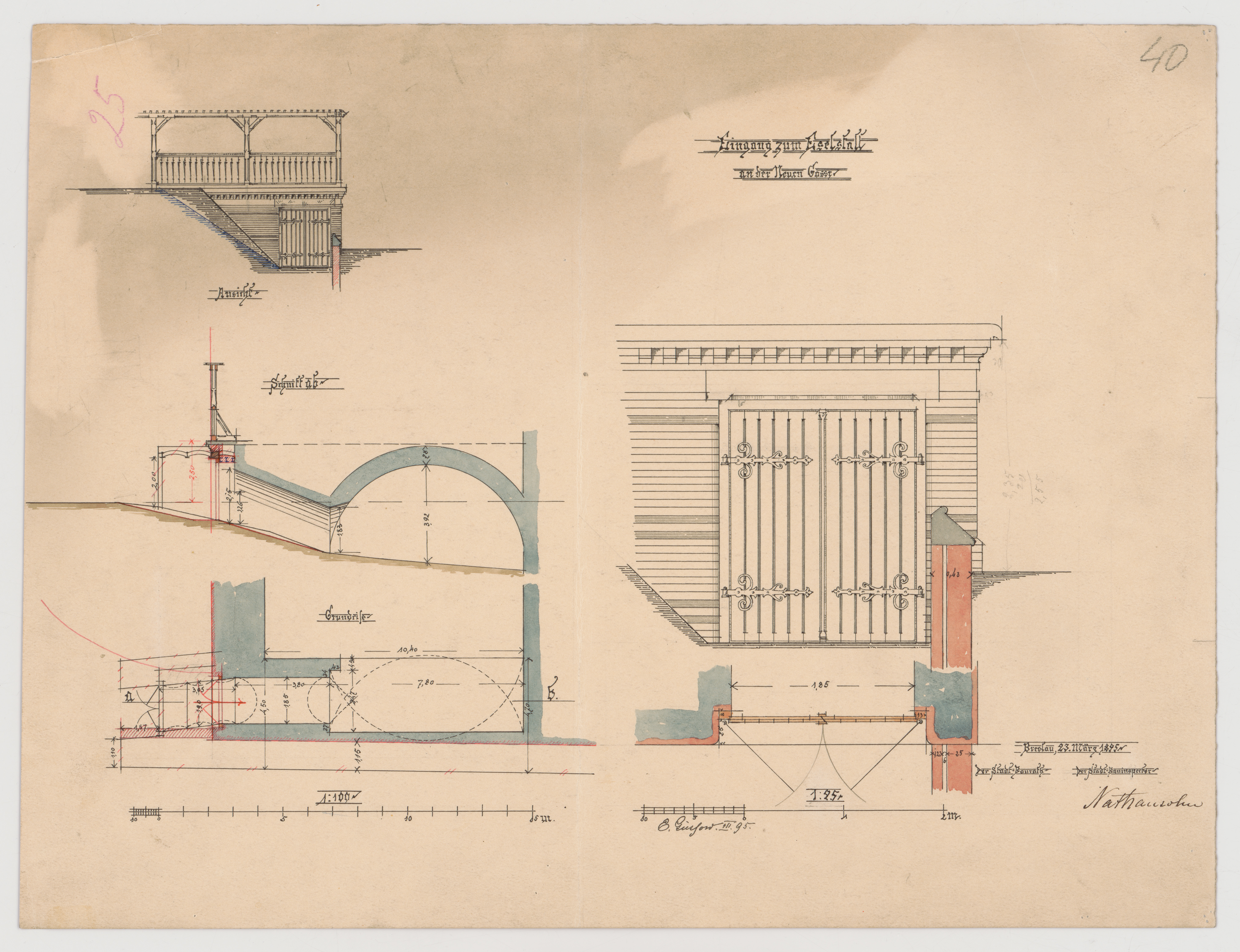 - rzuty przyziemia i wejścia, przekrój poprzeczny, elewacja frontowa, widok bramy
