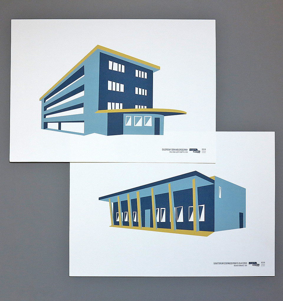 Zestaw obejmuje dwie grafiki: Galeriowy Dom Wielorodzinny oraz Sanatorium Pobytu Dziennego dla Dzieci.